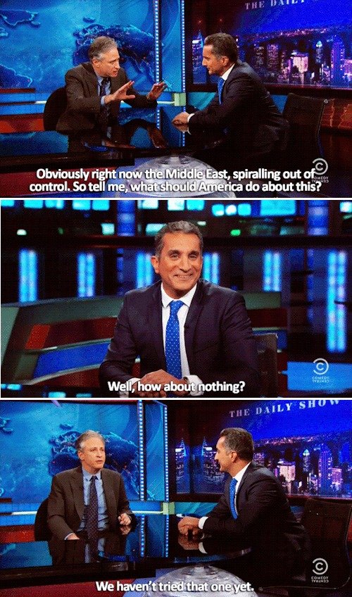 This was definitely an interesting segment. Not that I dislike Jon Stewart, but you often aren't objectively getting both sides of the argument, but in this segment they talked about how America doesn't deserve all the blame it gets, seeing as the place wasn't exactly great when we showed up, and that they've actually become partially dependent on us in some ways.