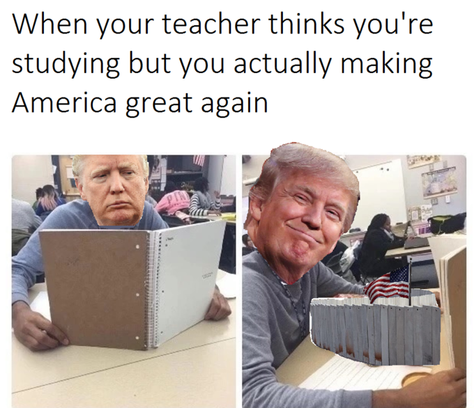 Nah just A wall Flag crixuz (See more...) prev next random - Fav Favorite Comment ✖ PrevTop NextComment prev next When your teacher thinks you' re studying but you actually making America great again ... +84 Views: 4606 Favorited: 0 Submitted: 12/31/2015 Share On Facebook -Favorite +Favorite Unsub from crixuz Subscribe to crixuz