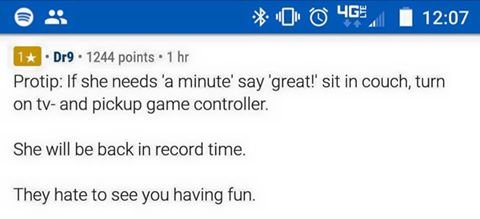 Protip: If she needs 'a minute' say beat!' sit in couch, turn