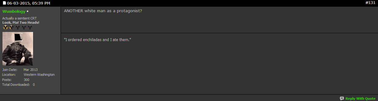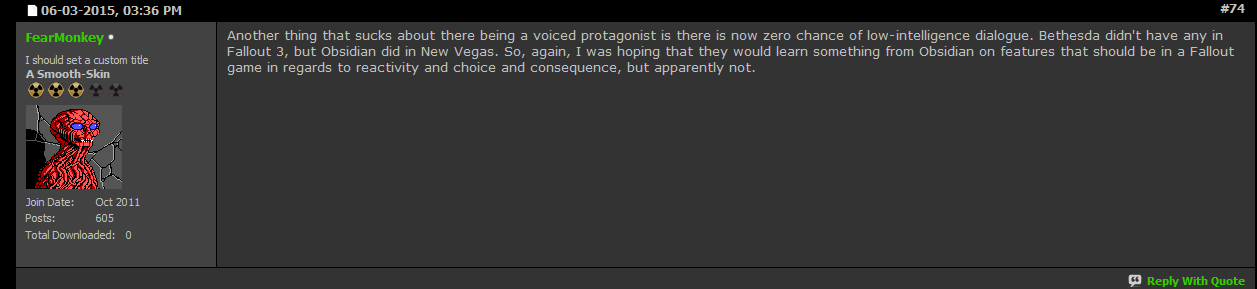And if they DID make low-int dialogue options, then NMA would call them out on making a publicity stunt due to everyone on the internet being offended because Fallout 4 makes fun of mentally challenged people.
