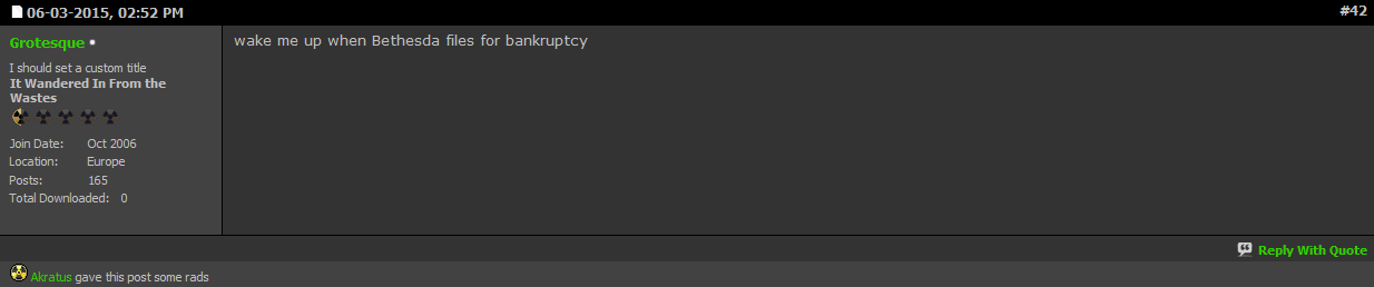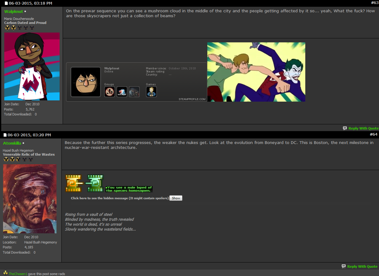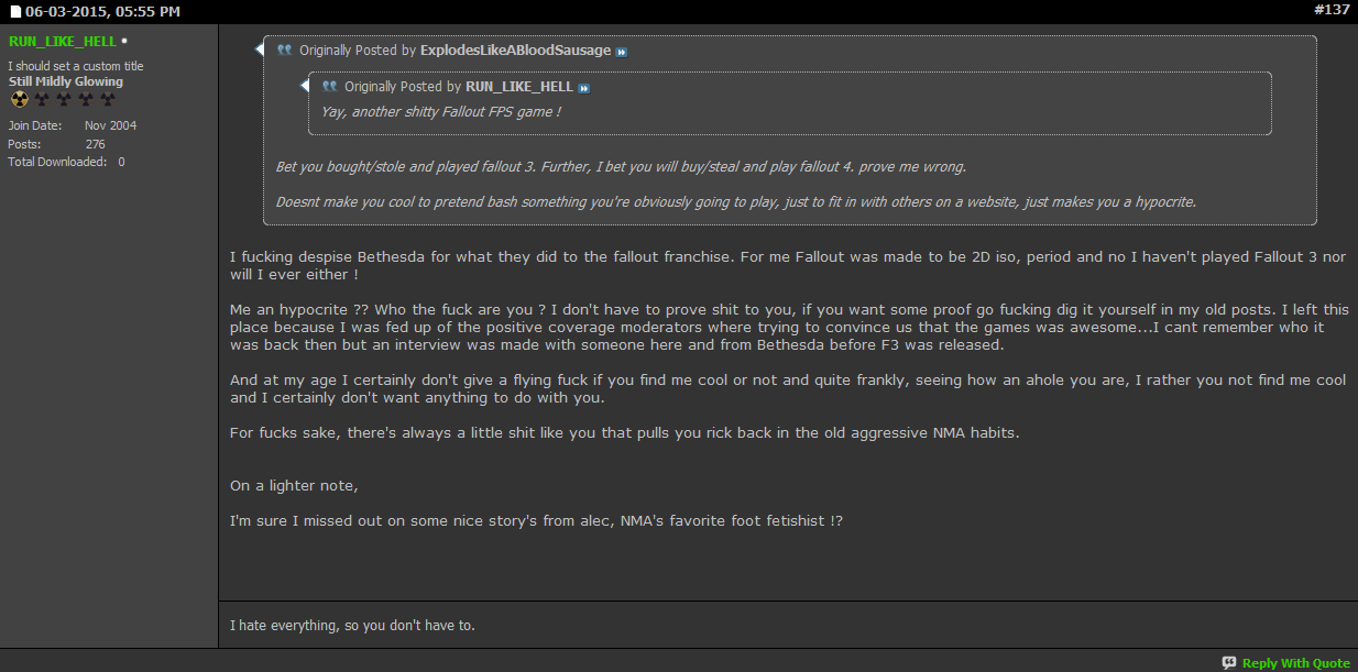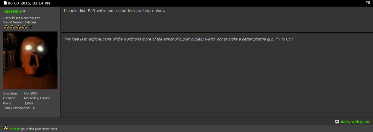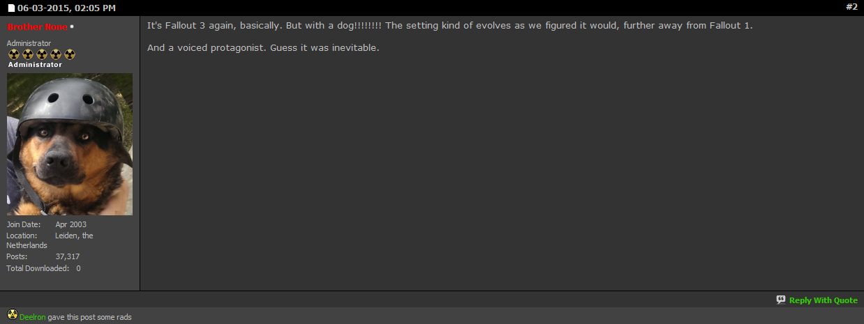 It's an internet forum founded by hardcore Interplay's Fallout fans (Fallout 1 and 2). They hate the living **** out of Bethesda's Fallout games because God forbid things change (especially Fallout 3, tho some tolerate New Vegas), and just circlejerk most of the day about how good the old Fallout games were. (They were good, but had their downsides, a story for another post if you want).