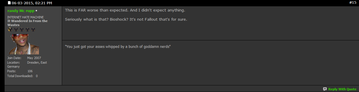 Okay, this is getting boring. Are you people seriously going to bash everything that's Fallout in a FALLOUT GAME just because it's not made by the oh-so-holy-and-saint Interplay? Why don't these people ever mention the things Interplay did with Fallout? Bethesda basically saved the damn franchise, damn it!
