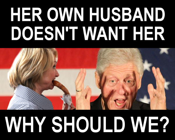 Not even Bill wants Hillary Flag matamoros (See more...) next random - Fav Favorite Comment ✖ Top NextComment Not even Bill wants Hillary, why should we? next Tags: Hillary Clinton | Bill Clinton | President | 2015 | election | Sausage | Erection | funny | Scared +9 Views: 2928 Favorited: 1 Submitted: 10/08/2015 Share On Facebook -Favorite +Favorite Unsub from matamoros Subscribe to matamoros