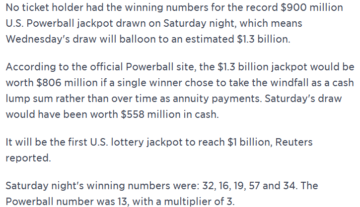 now 1 in 292.2 million Flag MuahahaOfLore (See more...) prev next random - Fav Favorite Comment ✖ PrevTop NextComment kinda disproves time travel prev next winner for the Powerball jackpot, Wednesday draw worth ... +32 Views: 3439 Favorited: 0 Submitted: 01/10/2016 Share On Facebook -Favorite +Favorite Unsub from MuahahaOfLore Subscribe to MuahahaOfLore