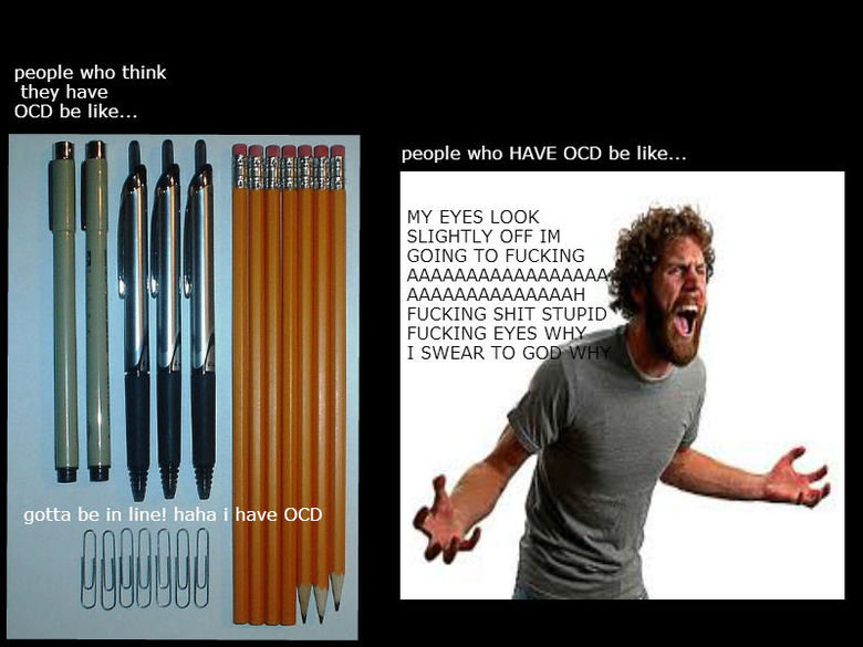 It still sort of bugs me how the Internet as a whole doesn't understand what OCD actually is, so there's a long running (too long) joke that anything out of place makes your "OCD act up." My brother has been diagnosed with OCD since he was a kid, and that's not how it manifests at all. In his case, he compulsively has to "even out" (how he first described it) anything that touches the right side of his body by touching the left side in the same place. OCD isn't about wanting things to be symmetric or nicely aligned - that's just natural for anyone to like, because it's pleasing to the eye. For something to truly be OCD, it has to be Obsessive and Compulsive (it's in the name, clever, right?), not just a preference for something (order) over something else (disorder).