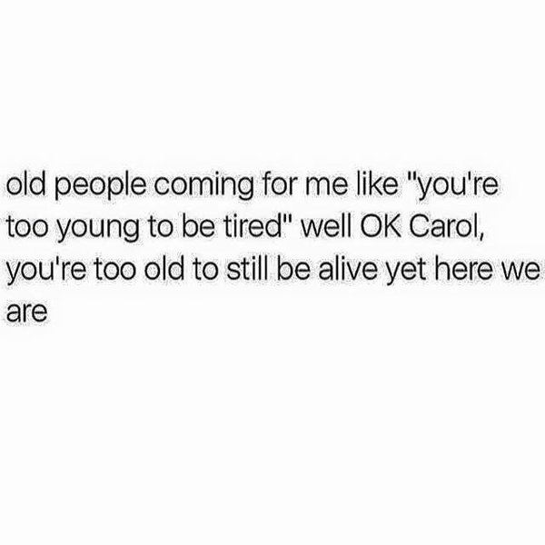 OK Carol Flag chokinandtokin (See more...) prev next random - Fav Favorite Comment ✖ PrevTop NextComment prev next old people coming for me like "you' re tayo young to be tired" well OK Carol, you' re too old to still be alive yet here we. are) ... +13 Views: 1497 Favorited: 0 Submitted: 01/11/2016 Share On Facebook -Favorite +Favorite Unsub from chokinandtokin Subscribe to chokinandtokin