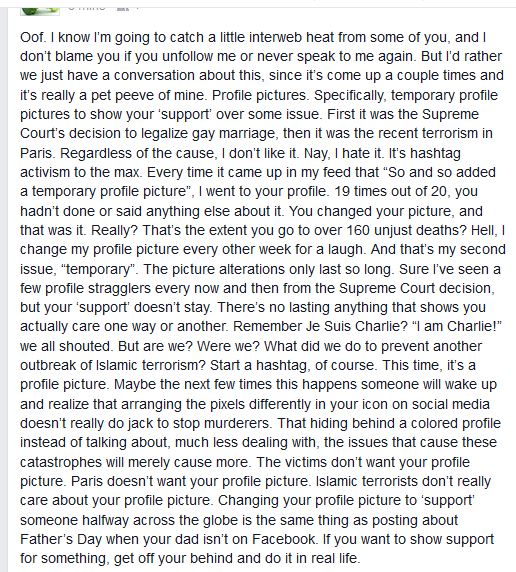 That's how I feel about it. On Snapchat there was a Pray For Paris thing going on, and I did see Parisians posting small videos thanking people for support in that way. I know I can't do literally anything to help them, it's up to my county's government to take action and help out. But hopefully the people affected by the attack can take some small comfort in going on Facebook and seeing literally millions of people sending their love over the Internet.