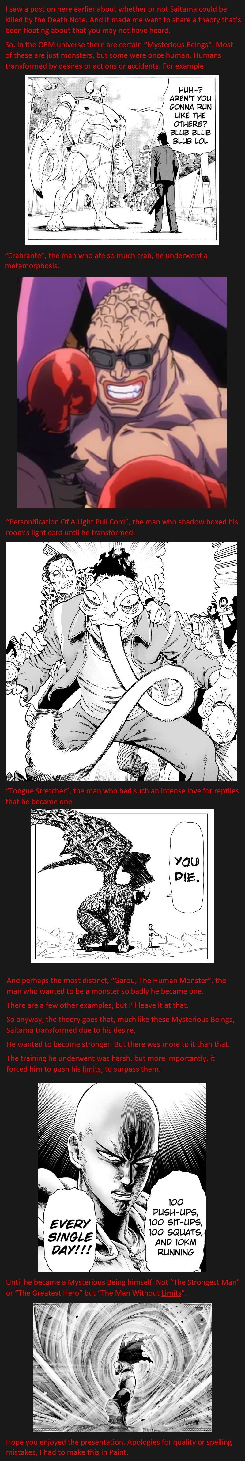 You really didn't expand much on the point of your ******* post. You have like 11 sentences explaining how people in this universe undergo transformations and then 2 talking about Saitama's transformation is because he doesn't have limits? Someone trying to do a pull up for the first time could be pushing his body past limits. This theory could be true but your explanation is ******* retarded. 100 push ups, sit-ups, squats, and running 10km every day sounds like a ******* limit to me. Why hasn't he pushed himself to do 101 push ups if he truly looks to break limits?