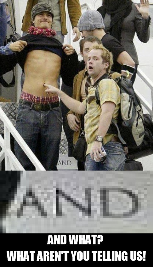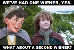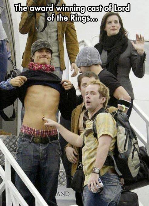 Pippin has his finger in Legolas' belly button, Frodo is behind him, and Merry is kinda looking down at what's going on. I might have misunderstood what anon was referring to.