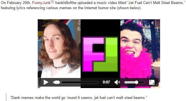On February 20th, Funnyjunki-' iil uploaded a music video titled Alet Fuel Can' t Melt Steel Beams.."