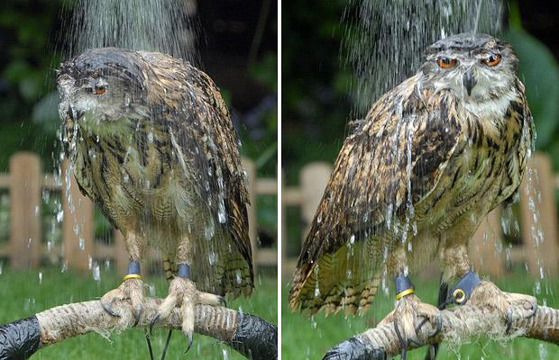 My aunt ran a Wildlife sanctuary when I was growing up, and I remember pretty much every owl would do this if you splashed them. I don't know if it's true, but one of the vets/presenters(certain animals were shown to the public to increase awareness and get that sweet sweet donation money) said it was because the owl would be inconvenienced if it was only partially wet and had to fly away because it would be uneven in weight and the wet feathers would not respond the same way the dry feathers would.