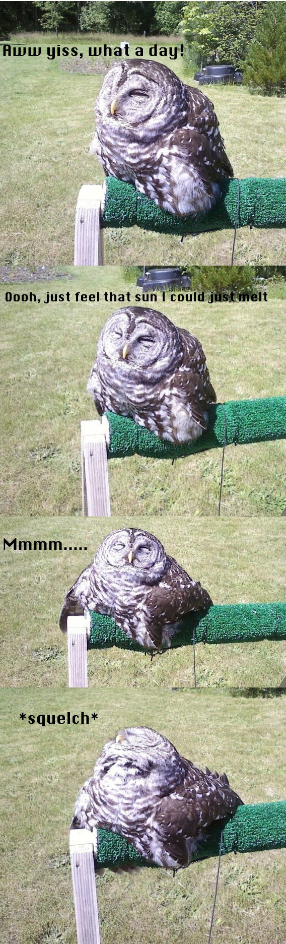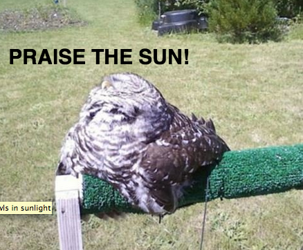 I think the owl might be spreading itself out not to gain more energy from sunlight but to release more energy from convection. then again, if it wanted to cool down, it would probably chill in the shade.. so i'm not exactly sure what's going on. it's probably just melting