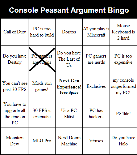 Call of Duty, Do you have destiny, can't see past 30fps, mods ruin games, next gen from space, exclusives, console outperformed PC, PS4life, do you haz halo, mouseboard is hard, minecraft?, doritos, last of us, ur an elite, nerdoom machine, MLG pro, DEWWWWWW