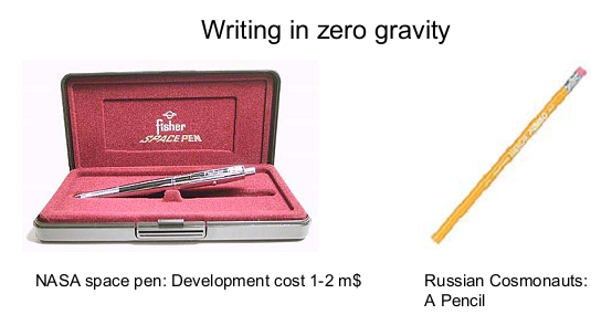 This myth is that the Americans spent millions to develop a "space pen" while the clever Russians just used a pencil. This is false, in fact both the Americans and Russians started off using pencils, however graphite is very conductive and so when the led snaps it gets sucked into the ventilation system, gets into the circuitry and starts a fire. This was most evident in the Apollo 1 disaster in February 21, 1967 killing the three astronauts, Grissom, White, and Chaffee.