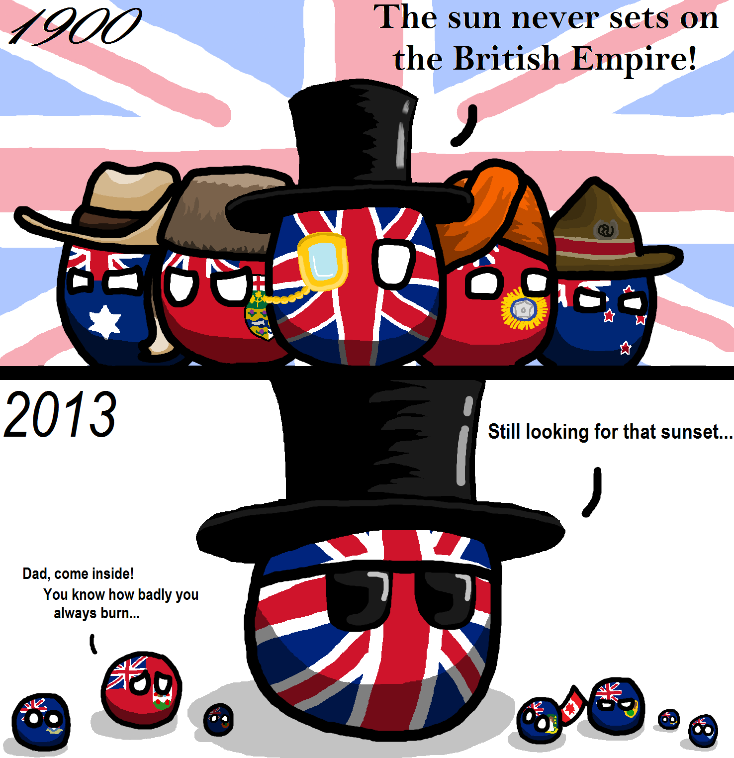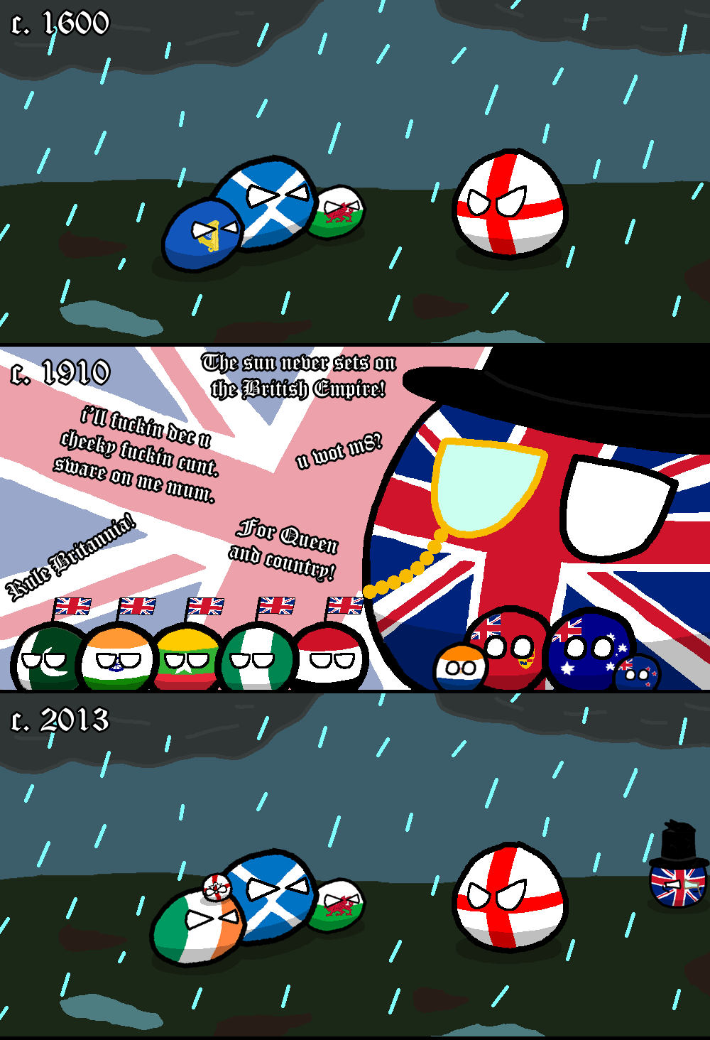 UKball is a kingdom of combined Countryballs located off the coast of Franceball. He is never found without accompaniment of a top hat, a monocle, a pocketwatch, and occasionally an umbrella (like a true gentleman should). He once dominated the world, you know. Rule Britannia!