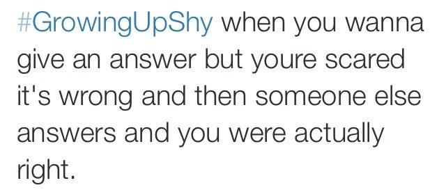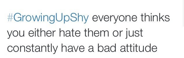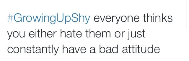 I hate being shy and knowing that the world probably thinks I'm a stuck up bitch because I don't talk to them. Because I don't know what to say and everything sounds stupid in my head so I just don't say anything.