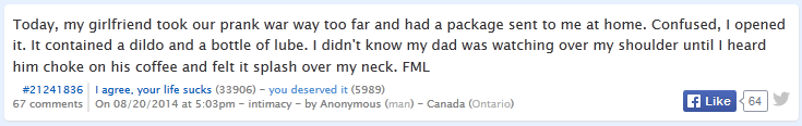 him choke on his coffee and felt it splash over my neck. FML