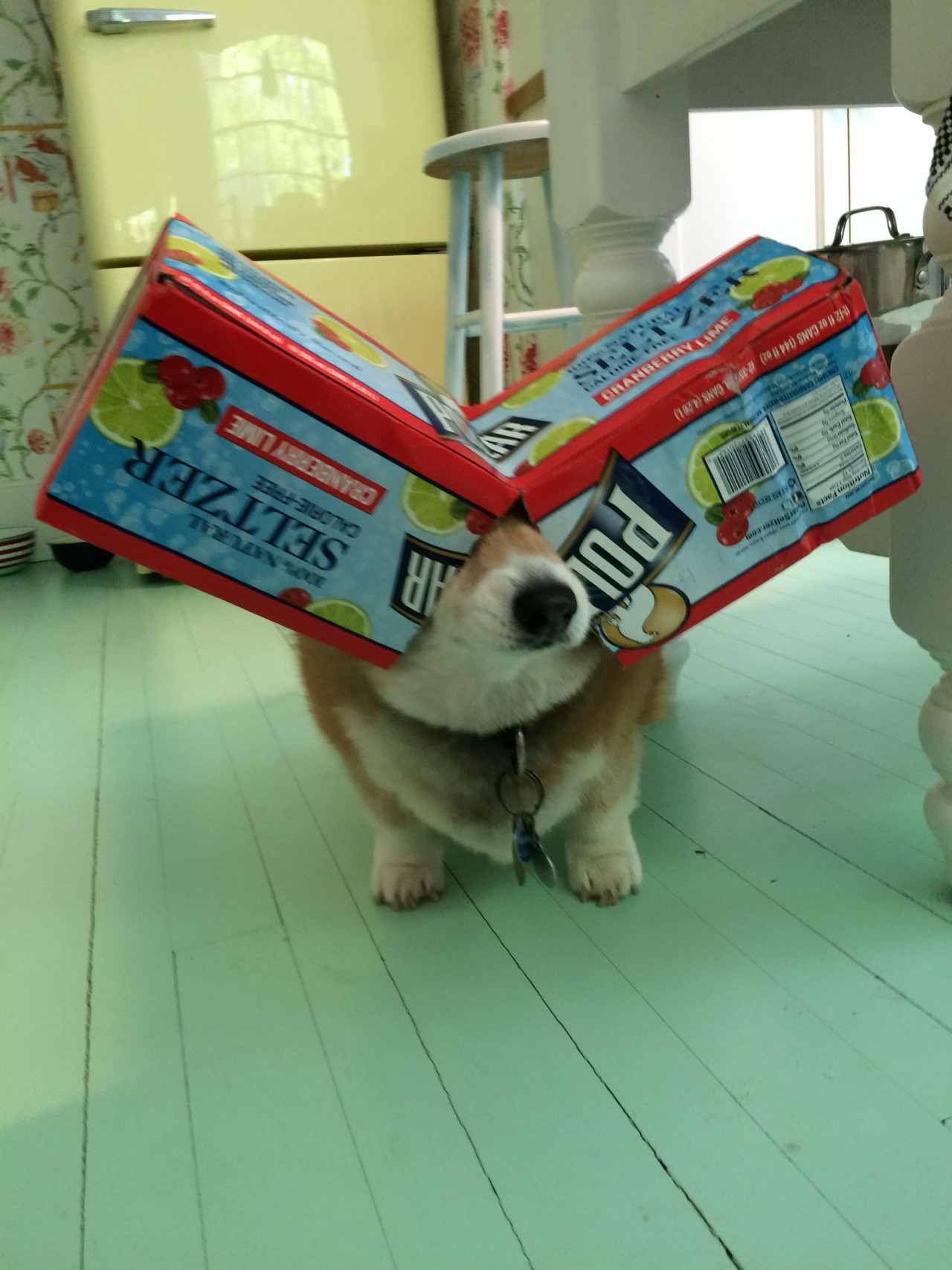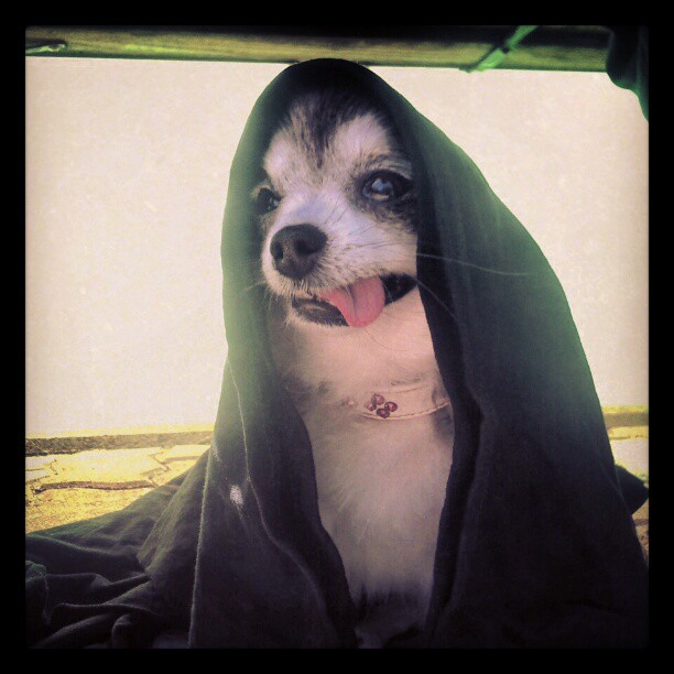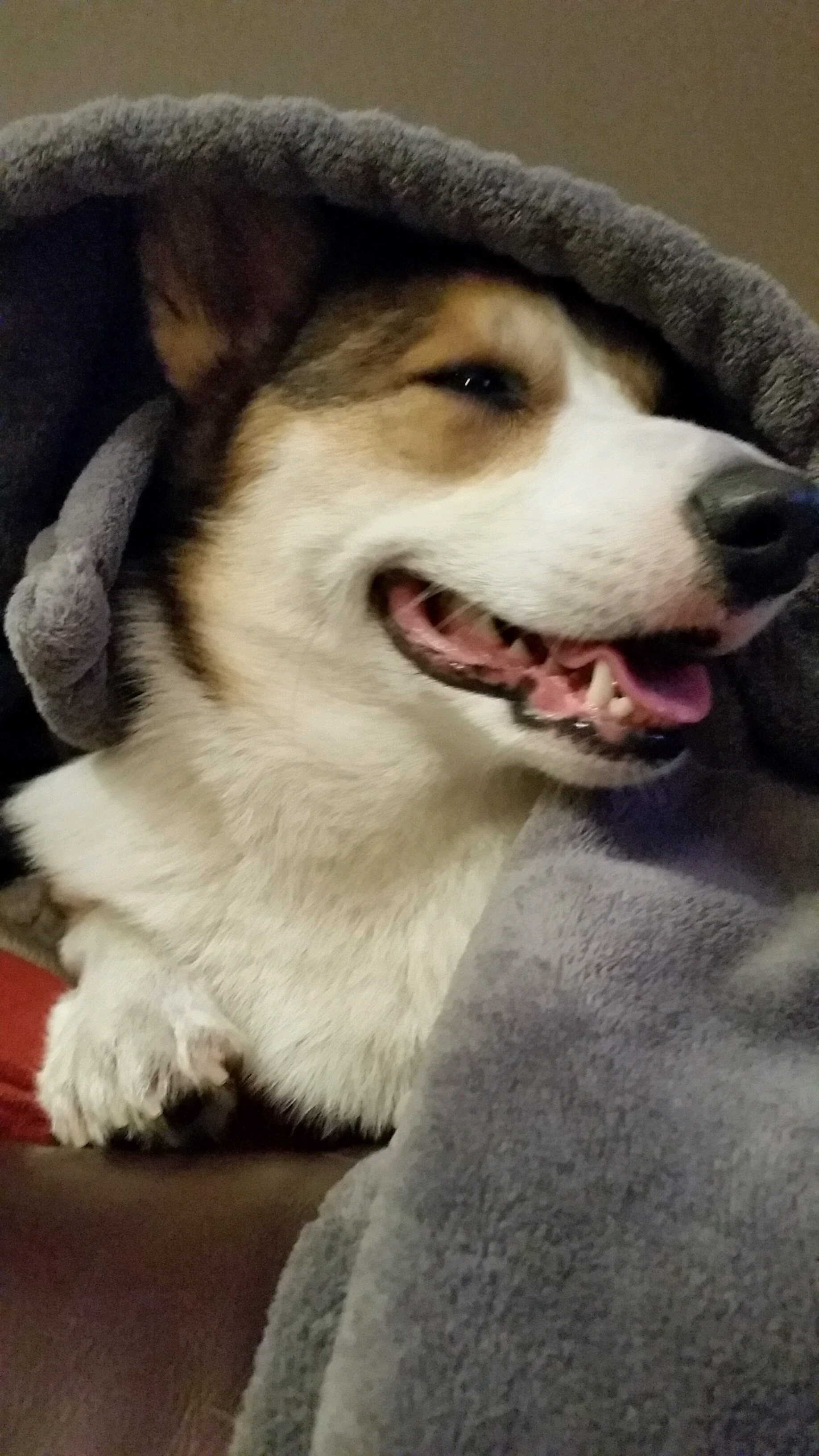 My pooch, Mini. She's a Corgi/Border Collie mix and she has the personality of a stubborn 7 year old. She looooves to talk and whine at everything and is a total pain in the ass. But, as I type this, she is curled up next to me against my leg and is fast asleep. I love her to death, for sure, despite the fact she's a bed hog. I literally have like a foot and a half of space to lie down in right now because of her dopey ass.