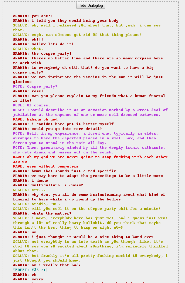 To try and clear things up a bit, I got a slice of a dialog from the comic, you don't have to read it like, all the way through. This is just an example of how the dialog is laid out