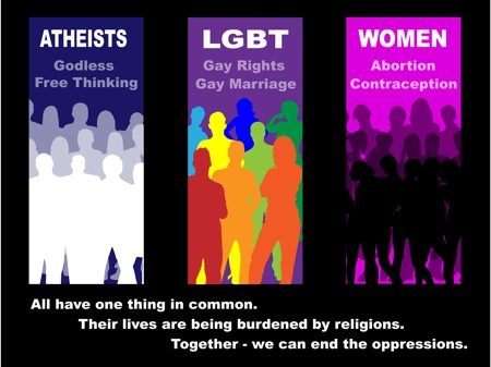 >But more commonly, extremist christians (or insert whatever religion here) are fine with and routinely lobby for laws that impose their religious beliefs on others. You don't see atheists doing that. The laws that atheists lobby for are to KEEP theists from doing that.