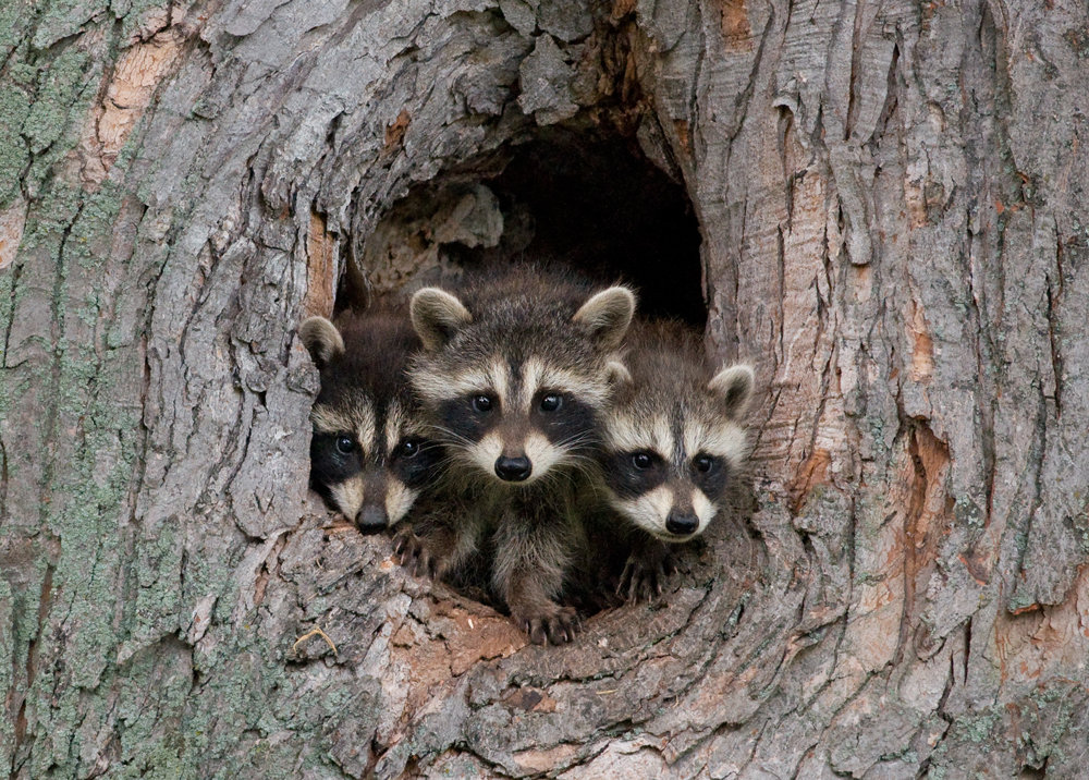 Raccoons are equally opportunistic when it comes to choosing a denning site. They may inhabit a tree hole, fallen log, or a house's attic. Females have one to seven cubs in early summer. The young raccoons often spend the first two months or so of their lives high in a tree hole. Later, mother and children move to the ground when the cubs begin to explore on their own.