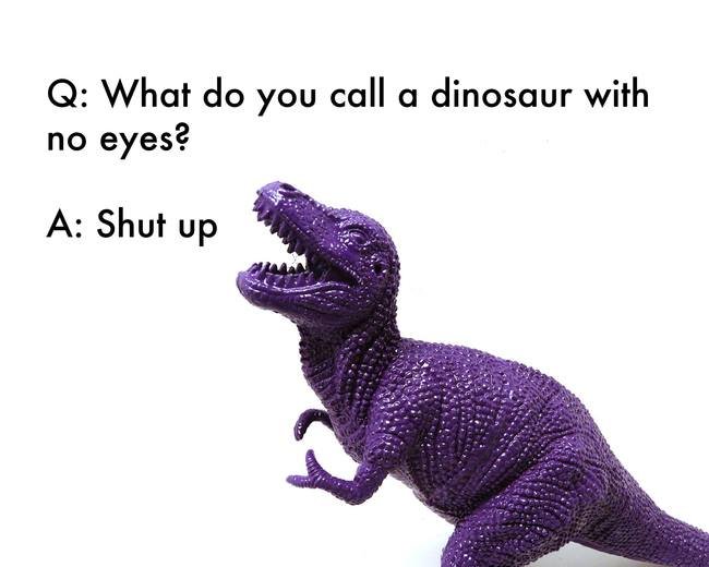 Really funny joke Flag wildditto (See more...) next random - Fav Favorite Comment ✖ Top NextComment Once I put play doh in my years when I was 6 and told my teacher I'd made ear plugs. Then I had to go to hospital to have it taken out next Tags: funny | joke | lol Cl: What do you call a dinosaur with no eyes? A: Shut up ... +2 Views: 908 Favorited: 0 Submitted: 11/27/2015 Share On Facebook -Favorite +Favorite Unsub from wildditto Subscribe to wildditto