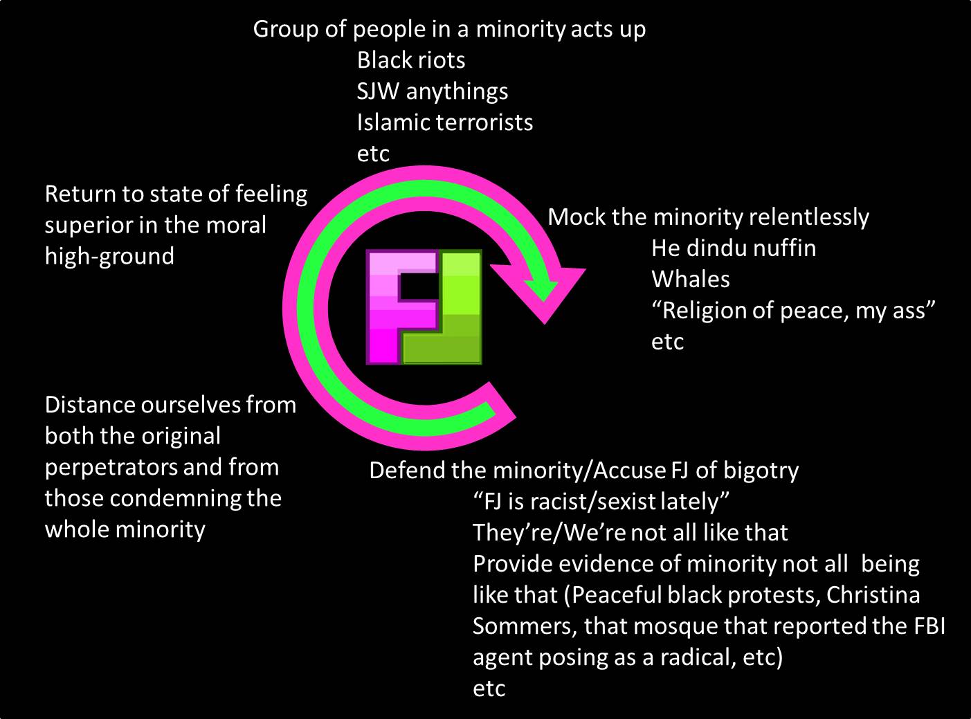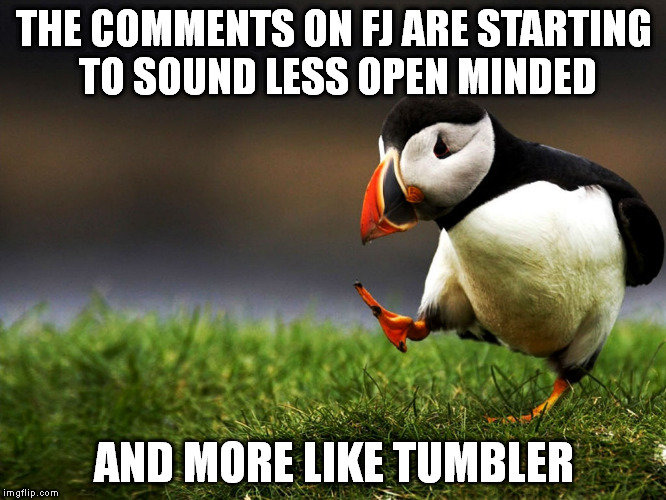 Yep, just replace black with white, women with men, and trans with cis and you pretty much go from FJ to Tubmlr, two sites that have funny content constantly interrupted by sheltered cirlcjerks and blatant sexism/racism