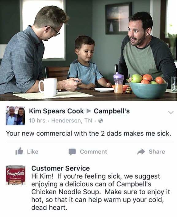 The set-up was made to point out they're a gay couple, not just a 'oh by the way' part. They did this hoping people would make comments like that above so people would be talking about this commercial, and thus Campbell's. Yeah, maybe a few radical people would refuse to get their product, but most who even disagreed wouldn't be passionate enough to boycott, and libtards now go out of their way to buy it to 'support them'.