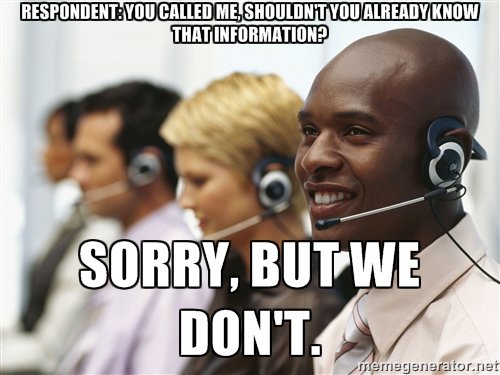 Sometimes this question makes sense, like if we’ve contacted them before and we’re asking for their mailing address. However, even if we did have whatever information we’re asking about in our records, we would still have to ask to be sure that it hasn’t changed recently.