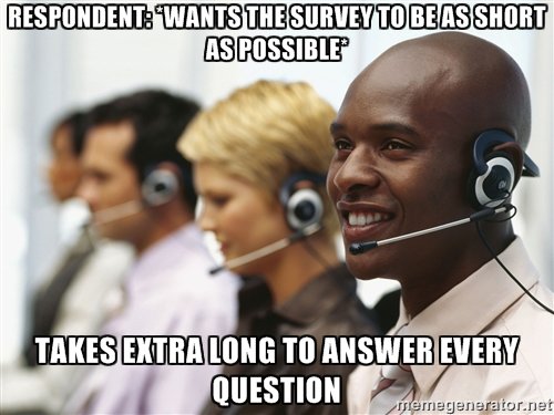 This happens annoyingly often. They ask how long the survey will take (which, BTW, we are usually more than willing to tell them), say they've only got just enough time to take the survey, then they take near-ridiculous amounts of time to answer each question. Then they get mad when we’re only halfway through the survey by the time limit the interviewer predicted!