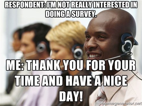 I work for a "Research Service" company. Other companies pay us to conduct telephone surveys, taste tests, and any other "market research" that they might want done. My job mostly consists of calling people and businesses and trying to conduct those telephone surveys or to ask them to participate in "Group Studies" at our company's facility. Sometimes we pay people to talk to us, sometimes we don't. It's usually pretty stress-free for a McJob, but occasionally people seem to go out of their way to make things more stressful than they need to by not being plain about not wanting to participate. These are some of the most common ways potential respondents (read: people we’re trying to get to the survey) shoot themselves in the foot when trying to get rid of us, as well some advice on how to make the survey process as short and painless as possible.