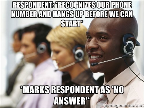 Second most common way to accidentally insure we call again. If you recognize the incoming number as a research service company and you pick up the phone and hang it up again, we can only assume that we were disconnected by accident. So we’ll mark it as ‘No Answer’ and you’ll probably be called again in the next couple days.
