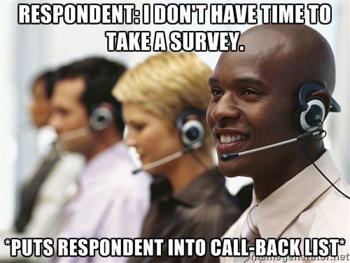 This is the most common mistake potential respondents make when they try to get rid of us. Whenever someone says something like this we are required to infer that they might have time to take the survey at a later date, so we mark it down as a call-back. It’s nothing personal, we just have to.