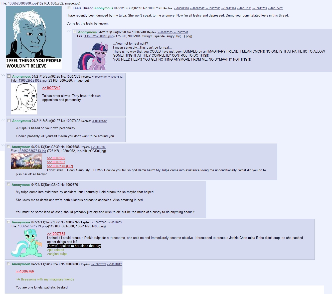 People don't always take it that far. Some people do, like they get involved in SWITCHING with their tulpa, taking their own consciousness into an imaginary dream land while their tulpa uses their body.