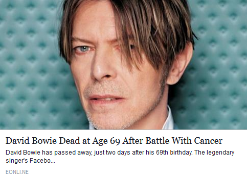 Ripperonie David Bowie Flag meandyamcha (See more...) prev next random - Fav Favorite Comment ✖ PrevTop NextComment You will be missed. He died on January 10th. (My Birthday) prev next David Bowie. Dead at Age. 69 After Battle "With Cancer David Bowie has passed !! E days after his with Ii% singer' s Fanatic... ... +2 Views: 929 Favorited: 0 Submitted: 01/11/2016 Share On Facebook -Favorite +Favorite Unsub from meandyamcha Subscribe to meandyamcha