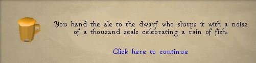 Runescape is a weird place.... The ale is my semen and the dwarf is your mom.. f gnu hand the ale to the dwarf who slurps it with a noise of a thousand seals ce
