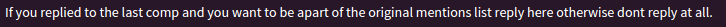 If you replied to the last comp and you want to be apart of the original mentions list reply here otherwise dont reply at all.