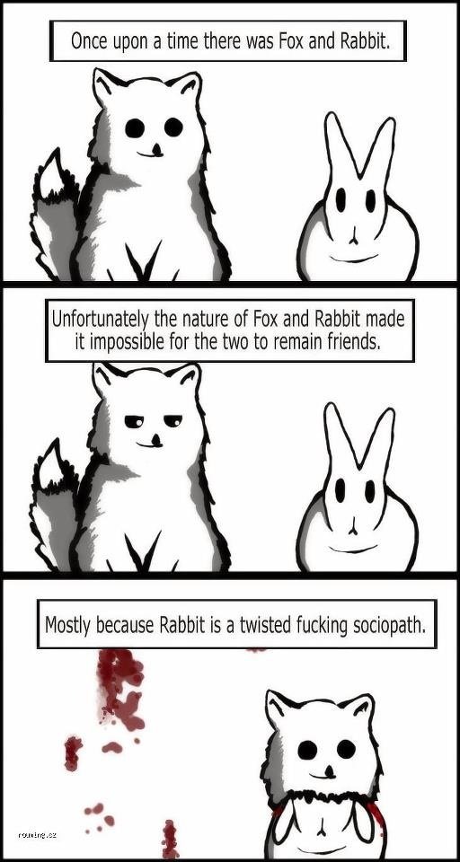 I don't know how old this post is but it just gave me a flashback. When I was in middle school almost 10 years ago I used to have this reoccurring vivid dream of a rabbit trapping a fox and cutting its face off and wearing it as it slowly roasted the fox alive over a fire, then would disembowel it and eat its intestines.
