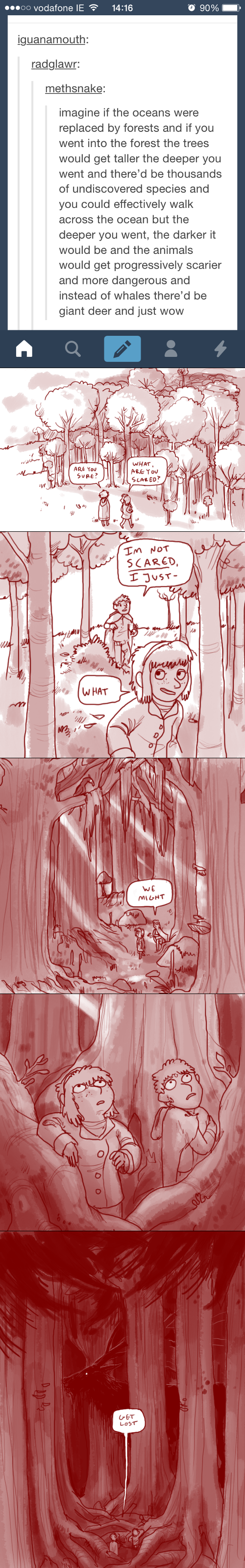 This person's idea is that just like the ocean, a forest would slowly get taller and scarier as you go in. While there are enchanted forest's in fantasy novels, I think this idea is more unique as these forests would completely replace the ocean, which could lead to exploration missions and such.