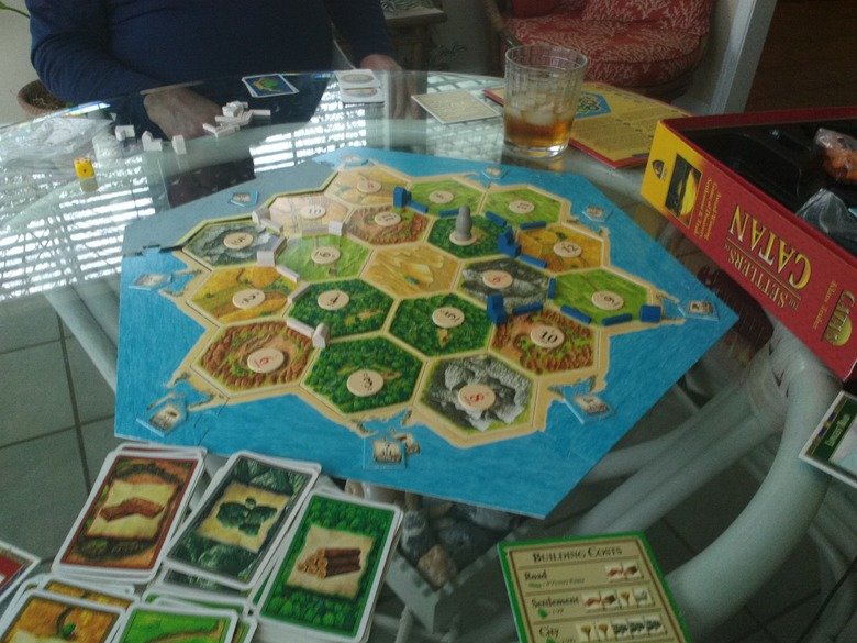 you know how the 5-6 player ver has another ring of land? well my brother-in-law and my father decided they love the game so much (as do alot of our family and family freinds) that they would take it one step further. my dad got a crappy bumper pool/poker table for his birthday a year before and the top was a large hexagon, so my brother in law who is an artist, designed a massive settlers board a whole ring larger than the expanded version, carved it into a wood placement that sits inside the table perfectly. My dad ordered more settlers player pieces, painted them different colors like silver and gold, and now we have had 9 players on a board at once. The love of the game is real.