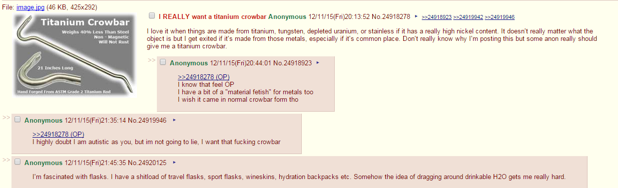 Ll I REALLY want a titanium crowbar Anonymous ( Fri) 20: 13: 52 No. 24918278 F :: 2:; -24919942 ::