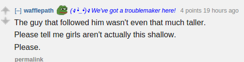 Also, I'd like to point out that girls rejecting guys for being too short isn't exactly a "double standard" because lots of guys have no problem rejecting girls for being too tall.