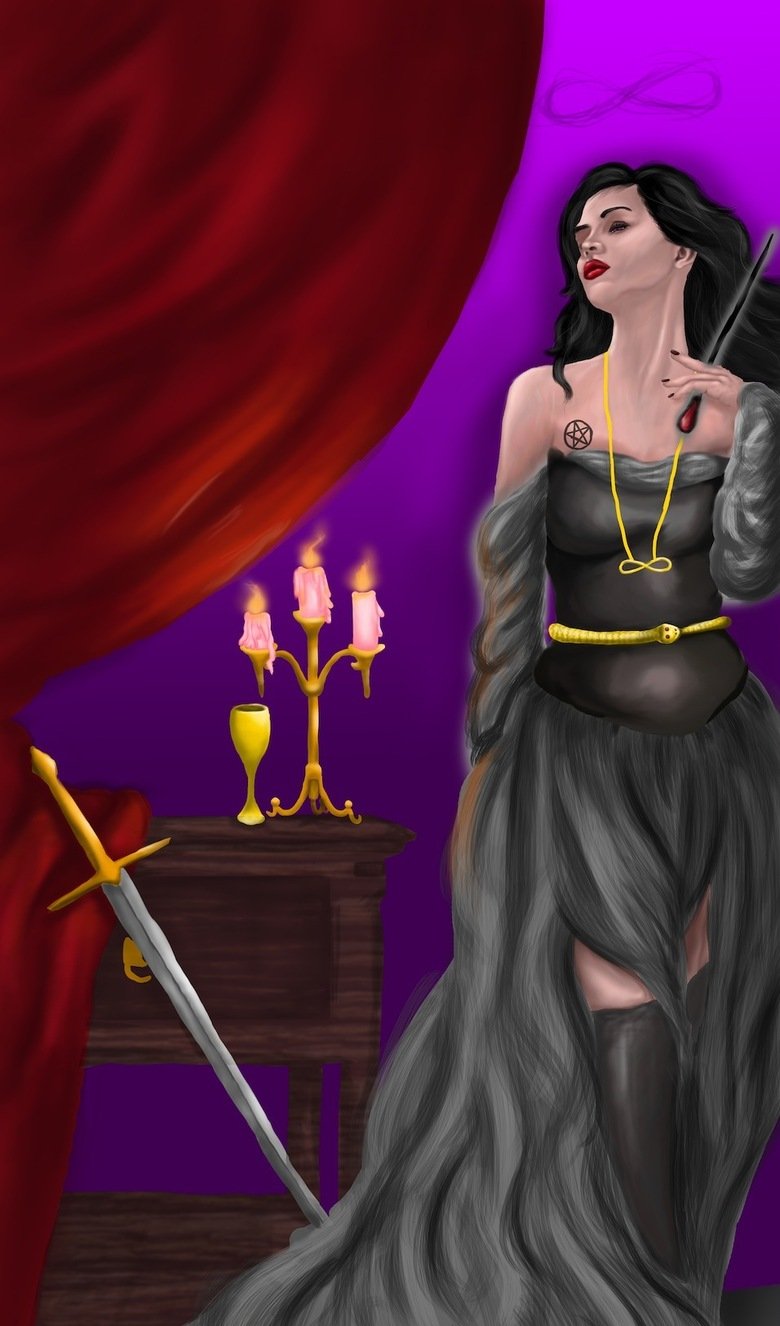 I dont know much about tarot, but if you position her differently you can have the items closer and positioned differently around her. Im guessing the blades are important, and the infinity symbol, not sure if the candles are important, but just to up the ante lets say they are.