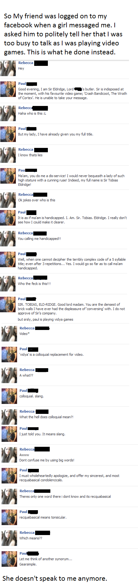 asked him to politely tell her that I was