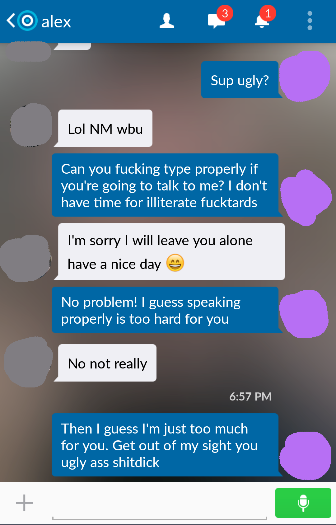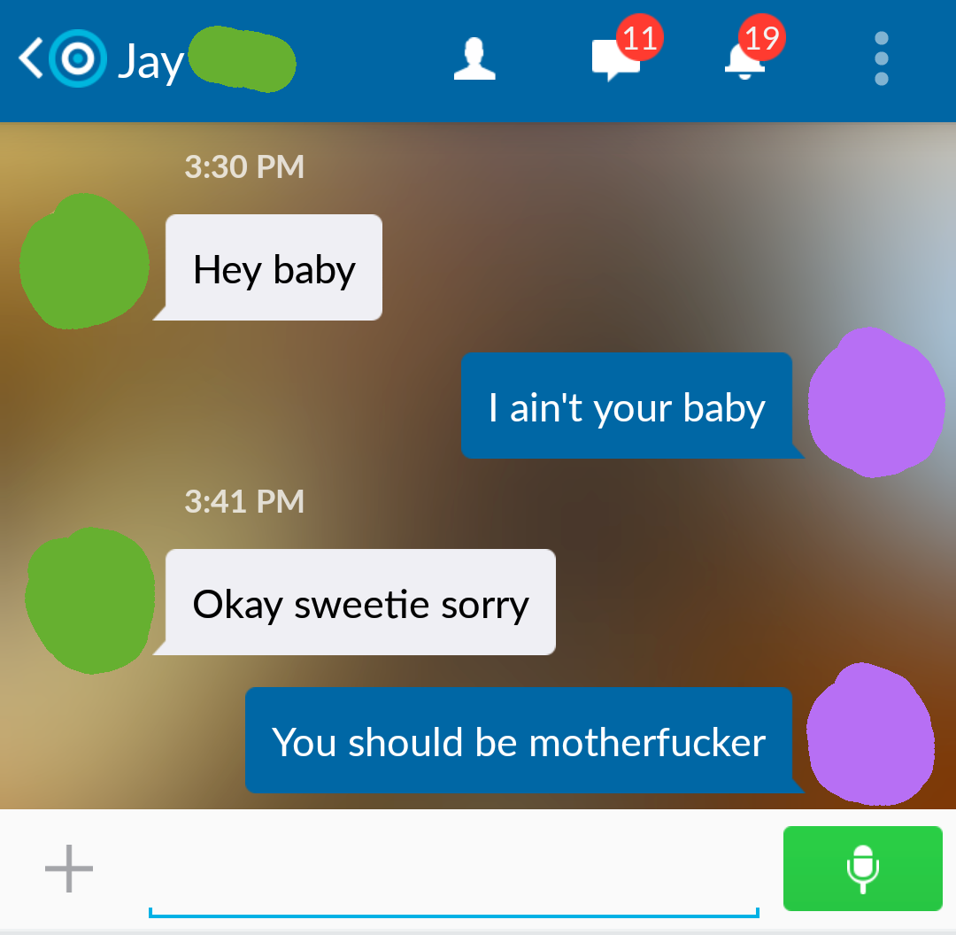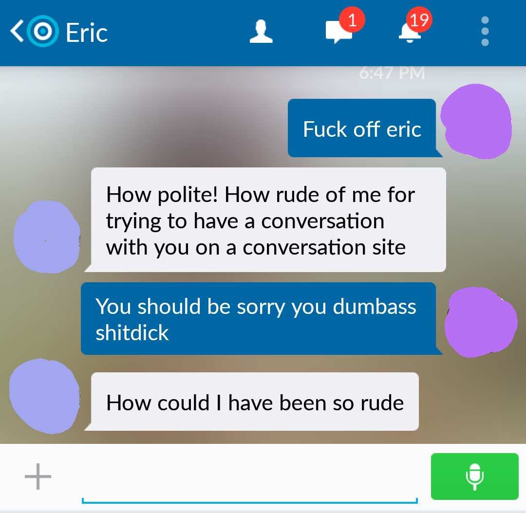 Before anyone judges me too harshly, just hear me out. I downloaded this meet up App called Skout, but all I get is messages from super weird, pervy, and downright creepy guys. So for laughs I decided to start messing with them instead of ignoring them. I only do it to the people that initiate a conversation with me and I don't do it to everyone. I do say some pretty bad things though, but just know I do not actually mean any of it. Also sorry if I get repetitive with the insults.