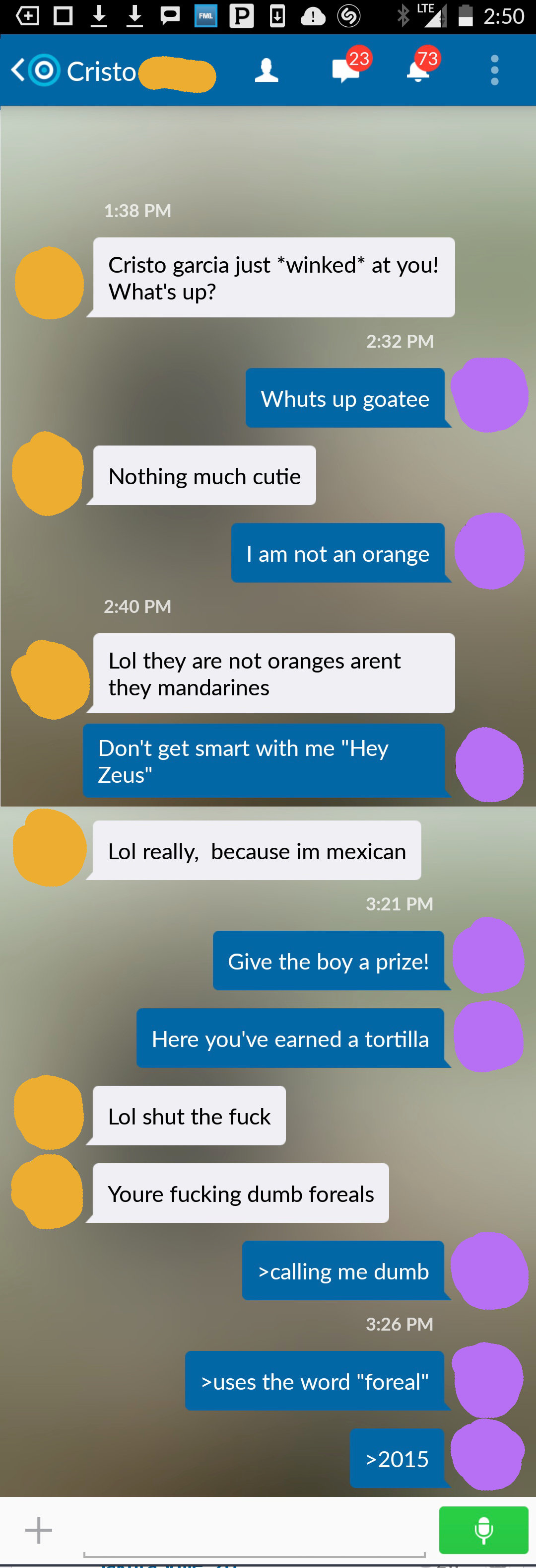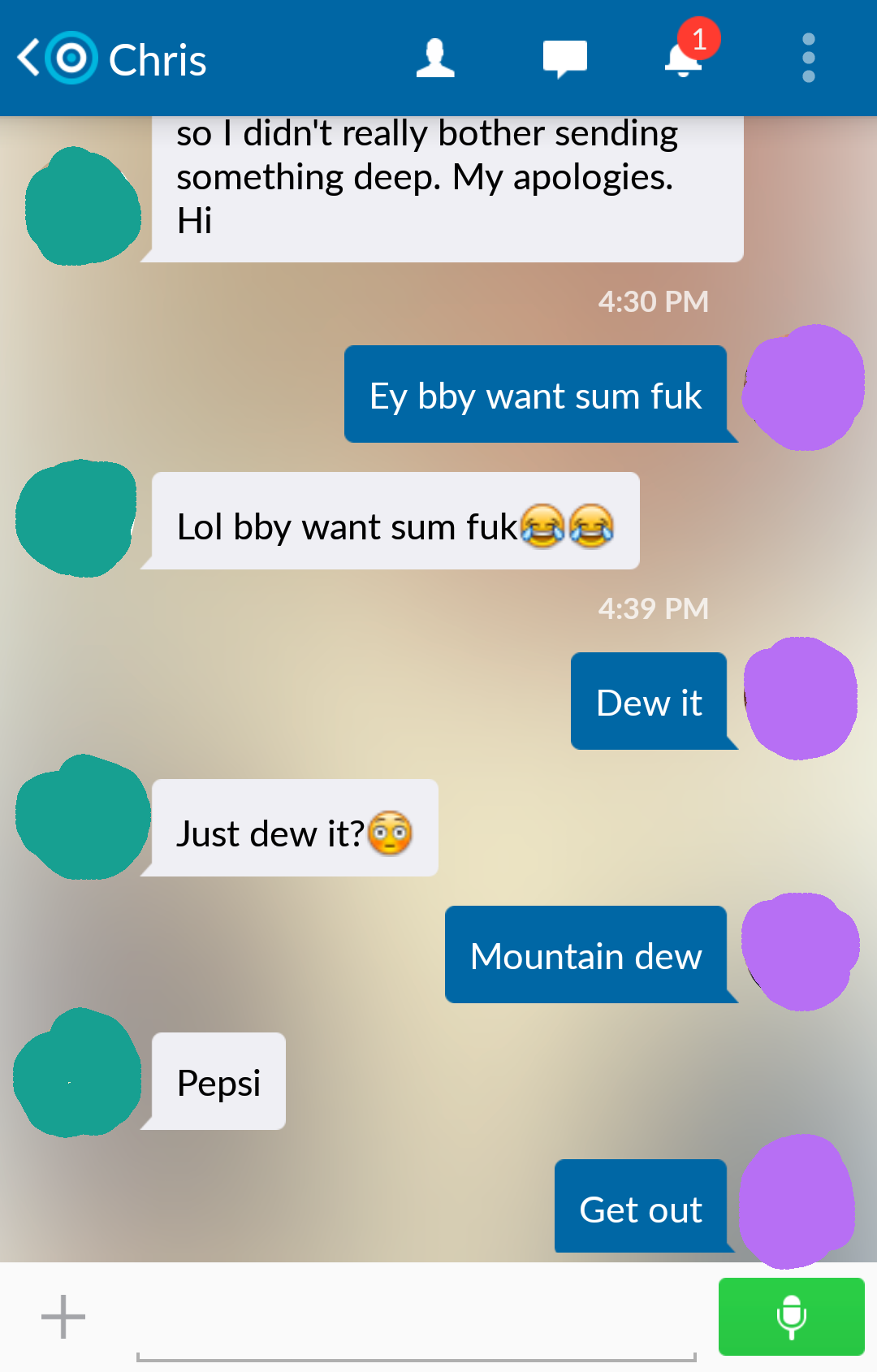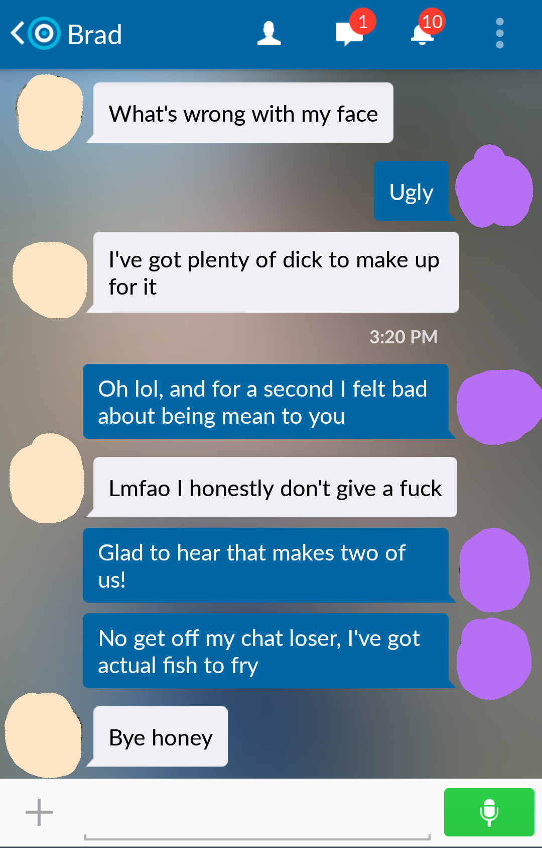 Before anyone judges me too harshly, just hear me out. I downloaded this meet up App called Skout, but all I get is messages from super weird, pervy, and downright creepy guys. So for laughs I decided to start messing with them instead of ignoring them. I only do it to the people that initiate a conversation with me and I don't do it to everyone. I do say some pretty bad things though, but just know I do not actually mean any of it. Also sorry if I get repetitive with the insults.