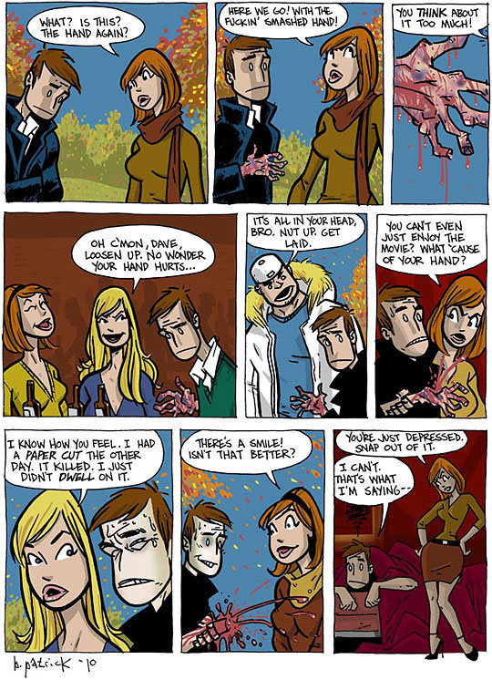 "I had a paper cut" As preserved by the self indulgent little **** who thinks no one could EVER possibly have gone through what he's going though. It's not even feasible to think that another person has a stronger will then you. It's totally impossible to force yourself out of YOUR unique special depression because absolutely no one else has ever felt the depths of dispute and loathing you and your ignorant ass is feeling right now.