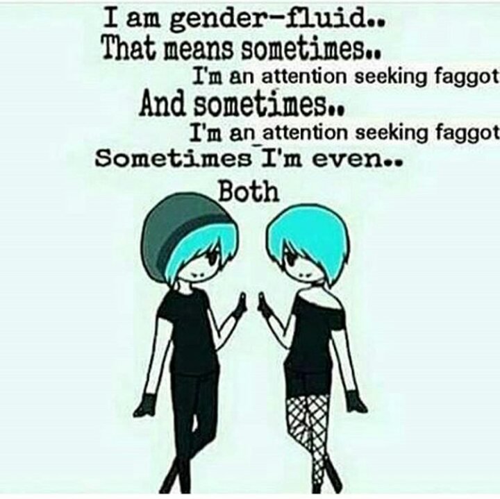 See what I just said? It is simple, it is nothing hard to grasp. You are not special, you're diffidently not gender-fluid. If you believe that you are? You want attention, because you can not believe something that stupid. But if you legit believe that there is a thing called gender fluid, and you are one. Then I already said you're stupid. You can have surgery to change your gender. But be happy with something you are given, i'm okay with sex-changing as it won't change my life any way. But I believe nothing is restricted because of your gender. And if there is, then that goes against your natural rights.