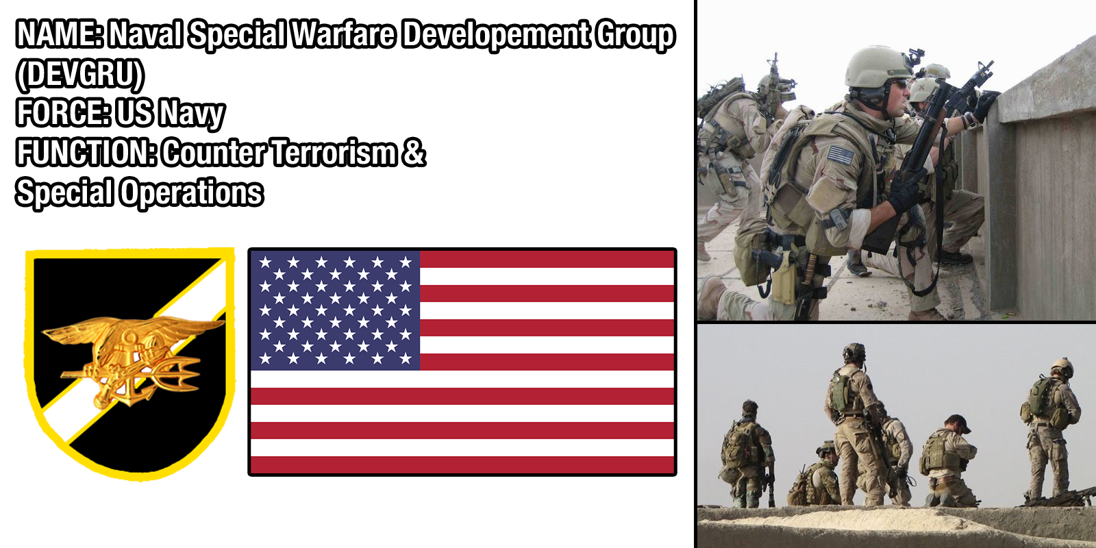 The US Naval Special Warfare Development Group, formerly known as SEAL Team 6, is the other half of the US Tier One capable operations force. Developed as full time counter-terrorist force in the 1980's, they were made to round out the capabilities of the US Special Forces.