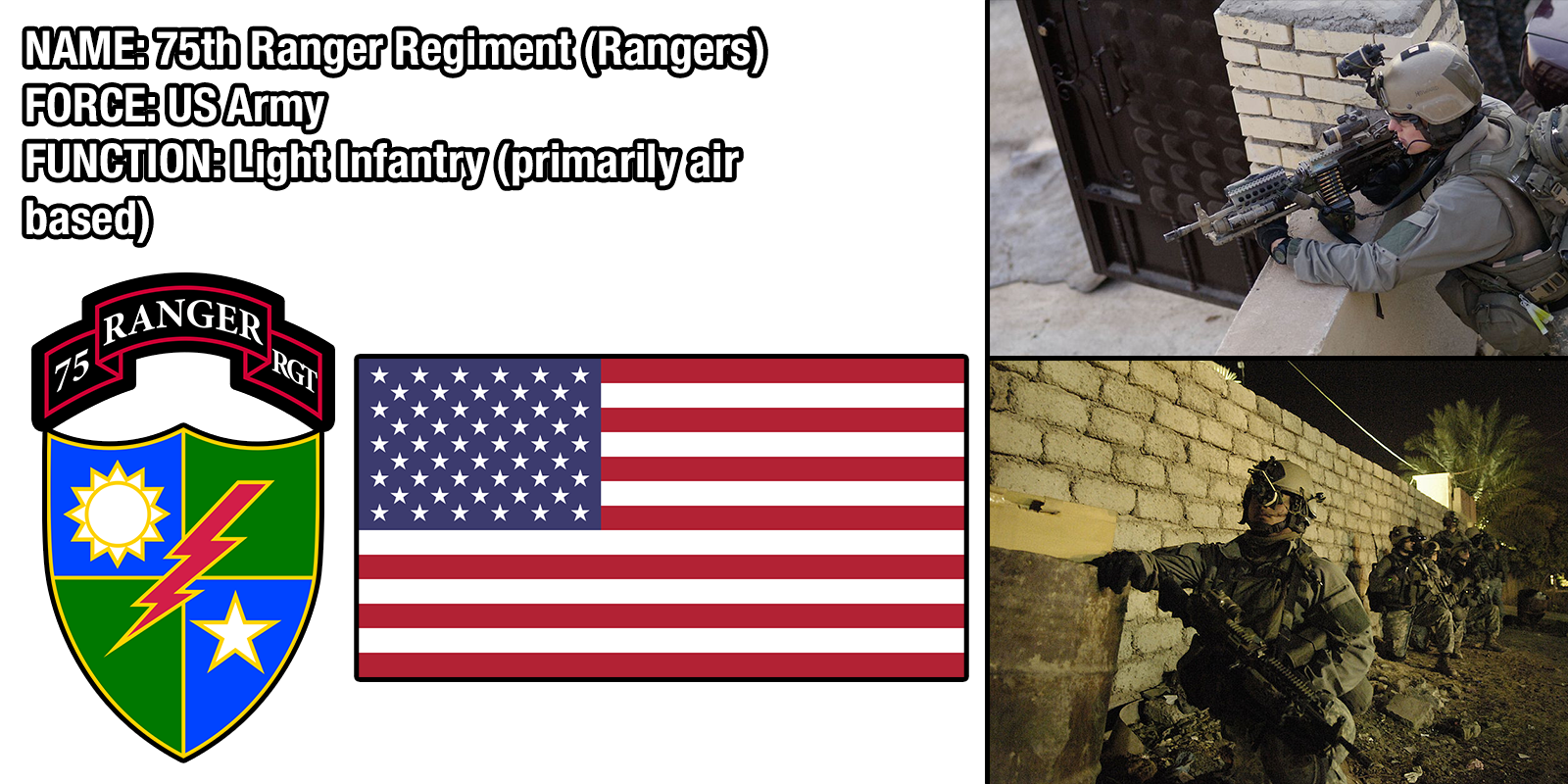 Though more a "elite light infantry" than a special force, the Ranger are nonetheless bad news, having proved themselves in the first Gulf War, Operation Enduring Freedom, as well as fighting alongside Delta Force during Operation Gothic Serpent.
